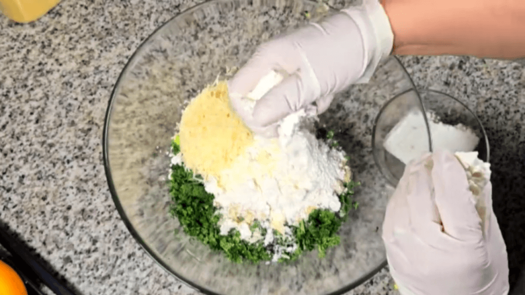 Dans un grand bol, mélangez les courgettes égouttées avec l’œuf entier, le jaune, l’oignon râpé, les herbes finement hachées (persil, aneth, menthe), les oignons frais émincés, la chapelure, la farine et le fromage râpé. Émiettez la feta avec les doigts au-dessus du bol. Mélangez bien jusqu’à obtenir une préparation homogène et compacte.